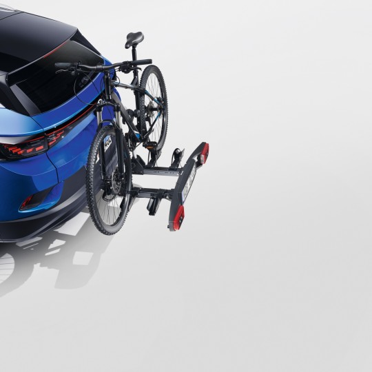 Le porte-vélos Basic pour le transport de deux vélos ou vélos électriques séduit par sa fixation innovante. Le porte-vélos se fixe automatiquement sur la boule d'attelage grâce à son engagement simple à la verticale avec rabattement consécutif vers le bas. La fermeture brevetée sans levier assure un montage aisé avec un minimum d'effort. Les écarteurs innovants amovibles équipés d'un codage antivol rendent le porte-vélos particulièrement convivial. Le support se replie entièrement et facilement pour un encombrement minimal et pour être rangé dans le coffre. Le support ne peut pas être rabattu sur le véhicule. Le support de plaque d’immatriculation d'origine, avec monogramme Volkswagen, vient compléter le support Basic.