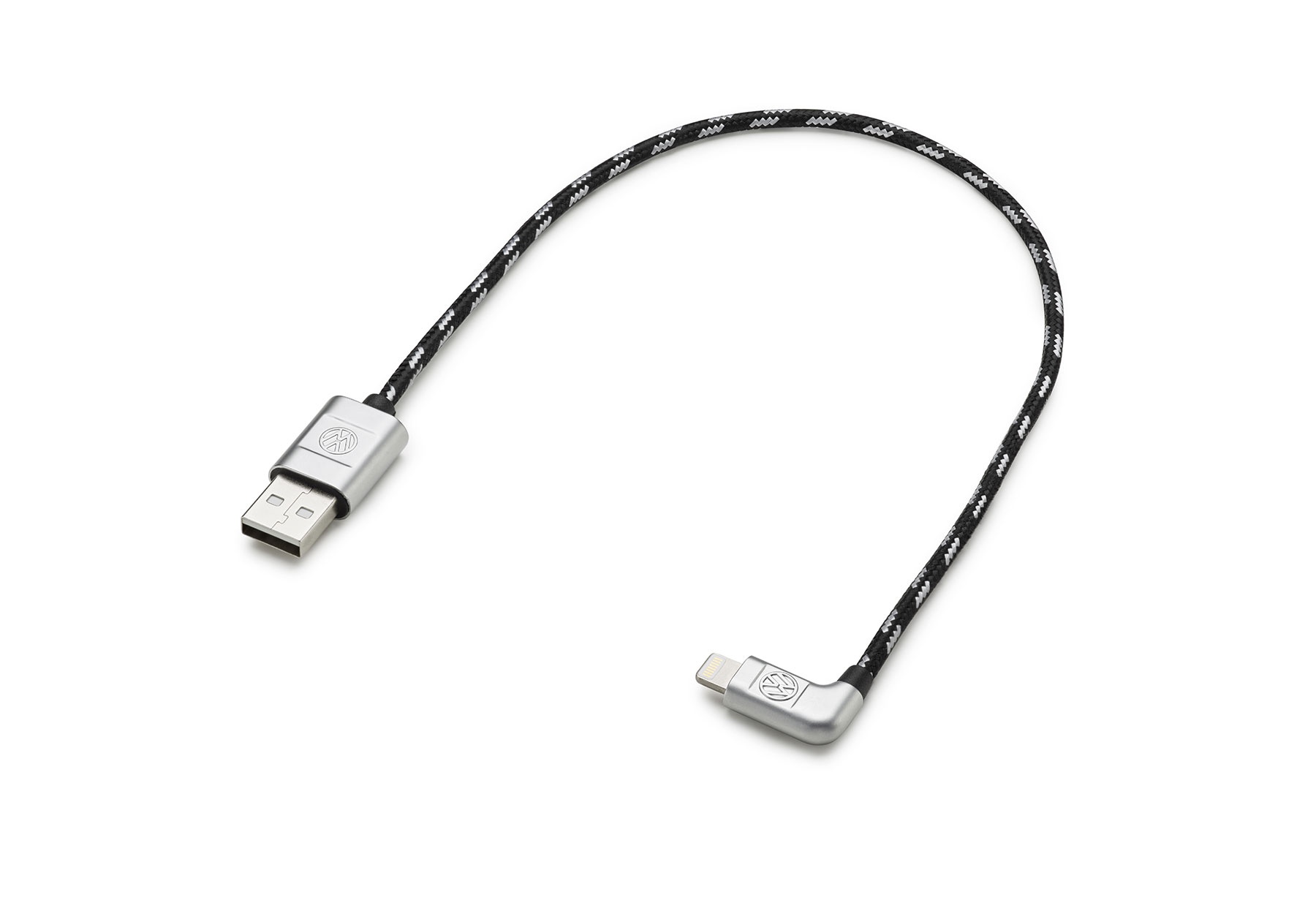 Rechargez votre iPhone et profitez pleinement d'AppConnect grâce à ce câble USB d'une taille idéale de 30 cm, très élégant avec ses connecteurs en métal chromés estampillés Volkswagen. Interface : USB-A sur Apple Lightning coudé Couleur : noir / argent Dimension : longueur 30 cm