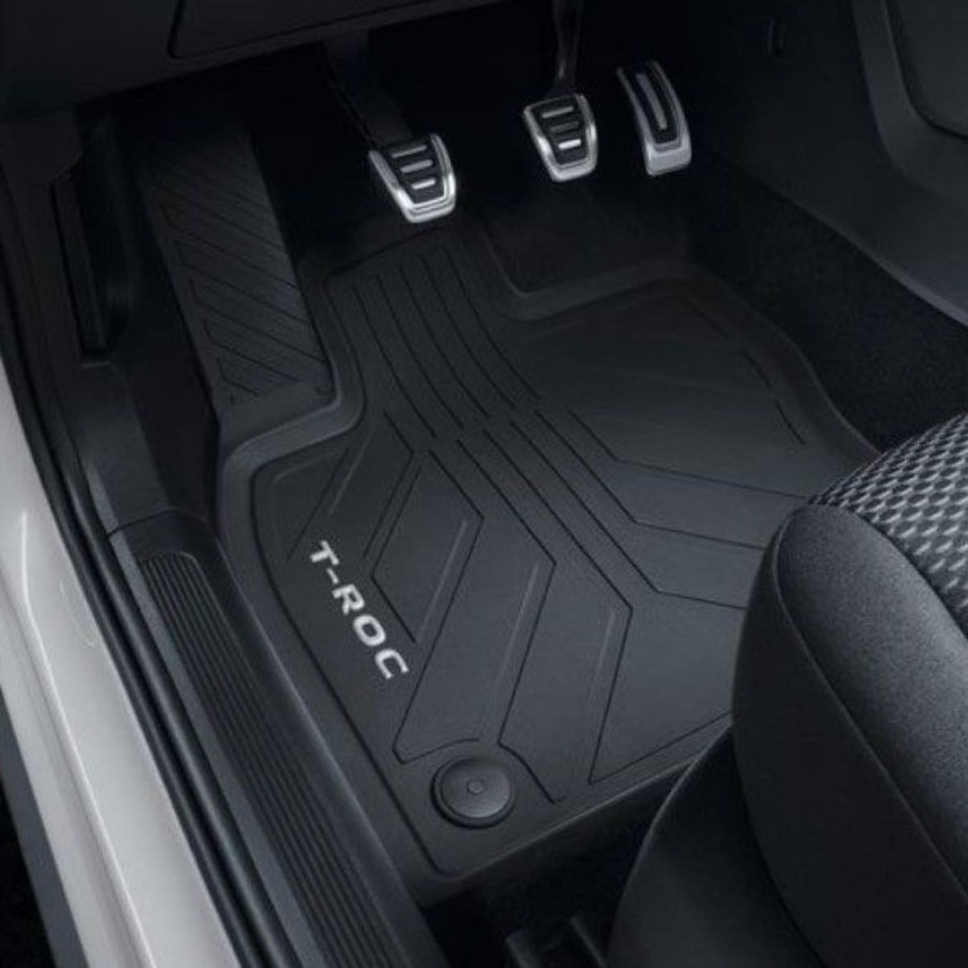 Protégez l'habitacle de votre Volkswagen avec ce jeu de 2 tapis avant sur mesure, fabriqués en caoutchouc et siglés T-Roc. Couleur : Noir. Design : avec inscription. Mode de fixation: Système de bouton poussoir.