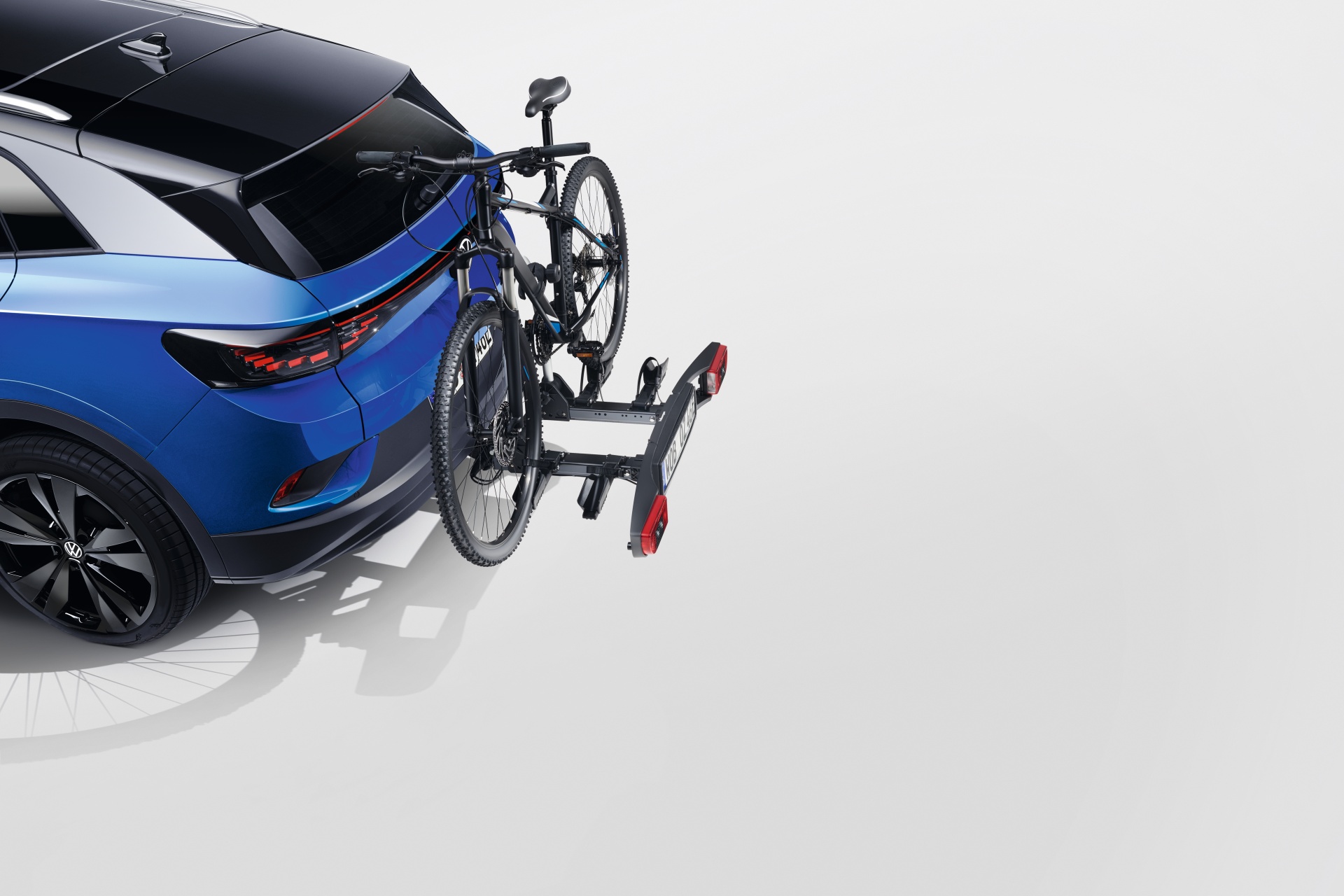 Le porte-vélos Basic pour le transport de deux vélos ou vélos électriques séduit par sa fixation innovante. Le porte-vélos se fixe automatiquement sur la boule d'attelage grâce à son engagement simple à la verticale avec rabattement consécutif vers le bas. La fermeture brevetée sans levier assure un montage aisé avec un minimum d'effort. Les écarteurs innovants amovibles équipés d'un codage antivol rendent le porte-vélos particulièrement convivial. Le support se replie entièrement et facilement pour un encombrement minimal et pour être rangé dans le coffre. Le support ne peut pas être rabattu sur le véhicule. Le support de plaque d’immatriculation d'origine, avec monogramme Volkswagen, vient compléter le support Basic.