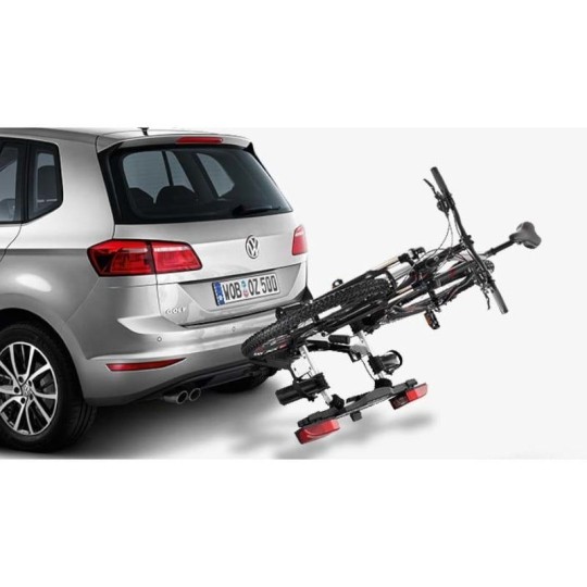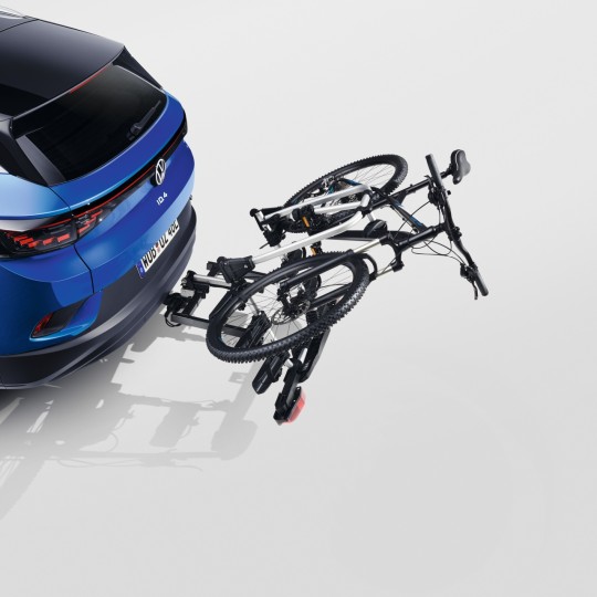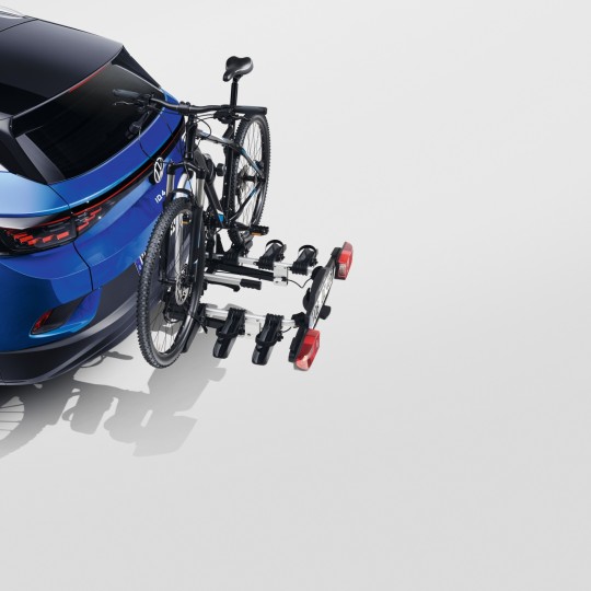 Le porte-vélos Compact III d’origine Volkswagen est petit, léger et compact. Il peut transporter jusqu'à trois vélos. Grâce au système pliable, les feux arrière, les rails pour vélo et le cadre porteur peuvent être complètement escamotés et rangés, notamment dans le coffre. Grâce au nouveau appui sur pédale, il est très simple de le rabattre sur le véhicule, même avec des vélos dessus. Ainsi, le coffre reste accessible. Lorsqu'on le remonte, il se verrouille automatiquement. Avec sac de transport particulièrement pratique.