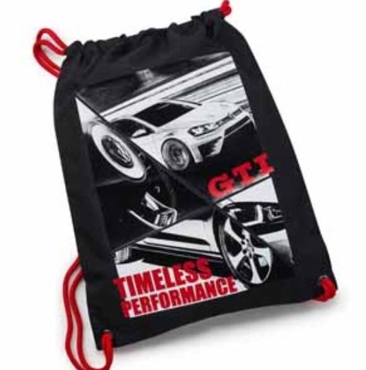 Sac tendance fermé par un cordon. Grande impression photo GTI sur le devant et étiquette tissée rouge « Bolide GTI » sur le côté. Les cordons rouges permettent de fermer le sac en haut et de l’utiliser comme sac à dos.